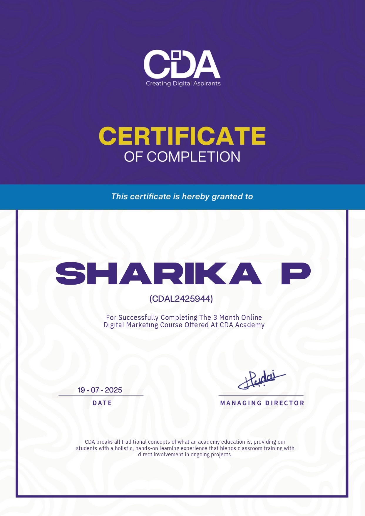 I have a professional certificate in Digital Marketing. I have acquired excellent knowledge in WordPress, Content Marketing, Canva, Meta Ads, Shopify, Ecommerce, SEO, Google Ads, Google Analytics, and Google Console from CDA Academy. That is why I am known as the Best Digital Marketer in Kannur. My educational background also includes a diploma in computer applications and a certificate in practical hardware. I am proficient in Adobe Photoshop, Illustrator, Premiere Pro, Corel Draw, and Page Maker. I also have basic knowledge in html, python, and C Programing. I ensure that I provide you with future-focused and diverse digital experiences.